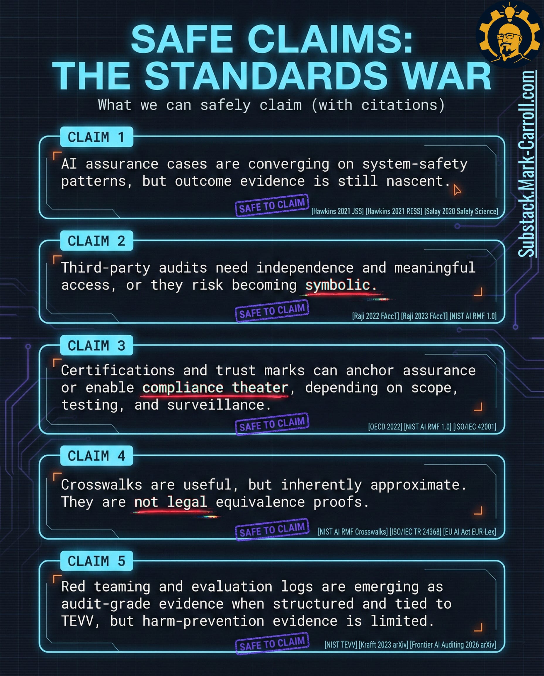 In the Standards War, credibility collapses in three predictable ways. The audit becomes symbolic. The badge becomes theater. The crosswalk becomes a fake proof. The next three visuals are a fast diagnostic for spotting each failure mode before it becomes a procurement decision you have to live with.