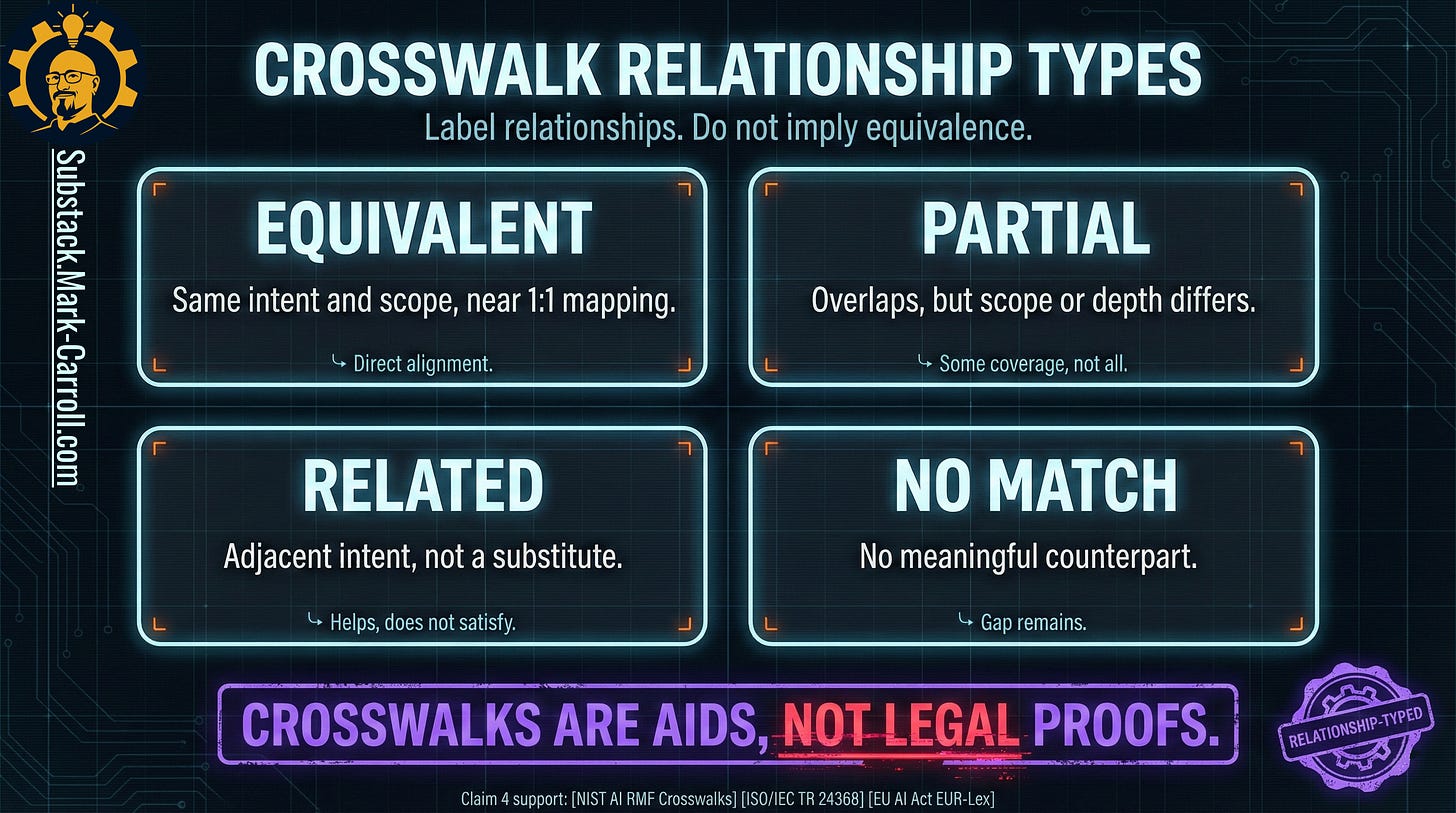 Crosswalks are useful when they are relationship-typed and honest about gaps. Crosswalks become dangerous when they’re used as equivalence claims. If you can’t name the relationship type, you don’t have a mapping. You have a sales story.