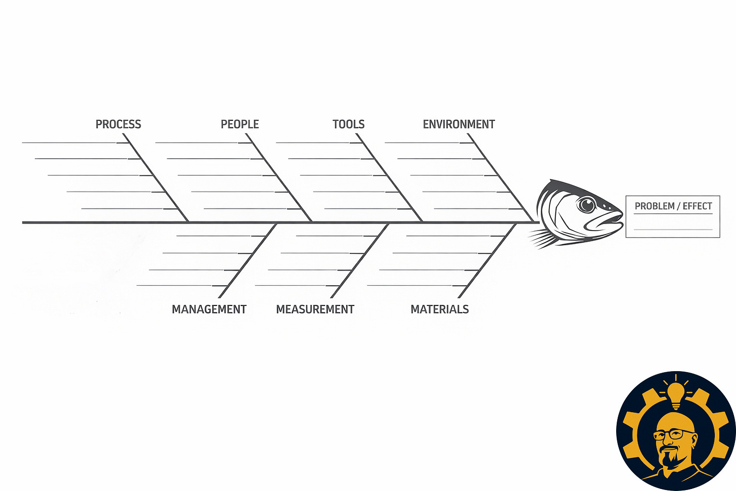 Begin by writing the problem at the head of the fish in plain, observable language. For example: “Customer onboarding takes 14+ days and produces frequent rework.” Then add 5–7 main branches as your first pass. If you use the classic starters (Process, People, Tools, Environment, Management, Measurement, Material), treat them like training wheels. Keep what fits, rename what doesn’t, add what’s missing.
