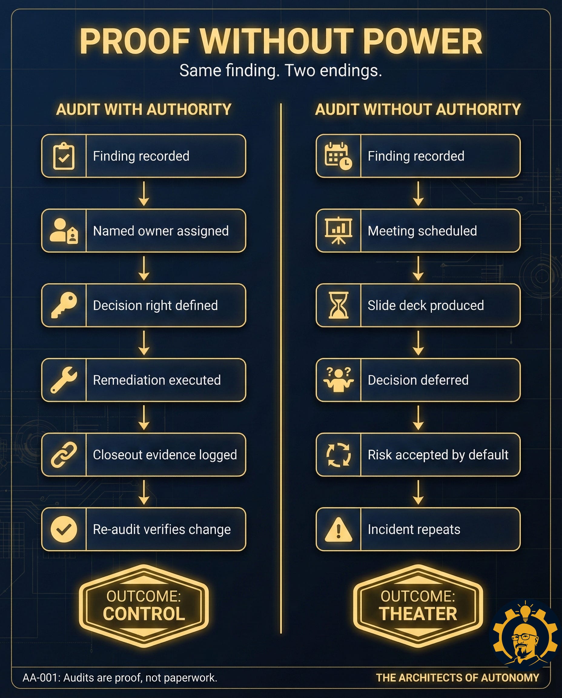 This post gives you the one-page Audit-to-Authority Map that forces every finding to have a named owner, a real decision right, and closeout evidence you can re-audit. The rule is simple: