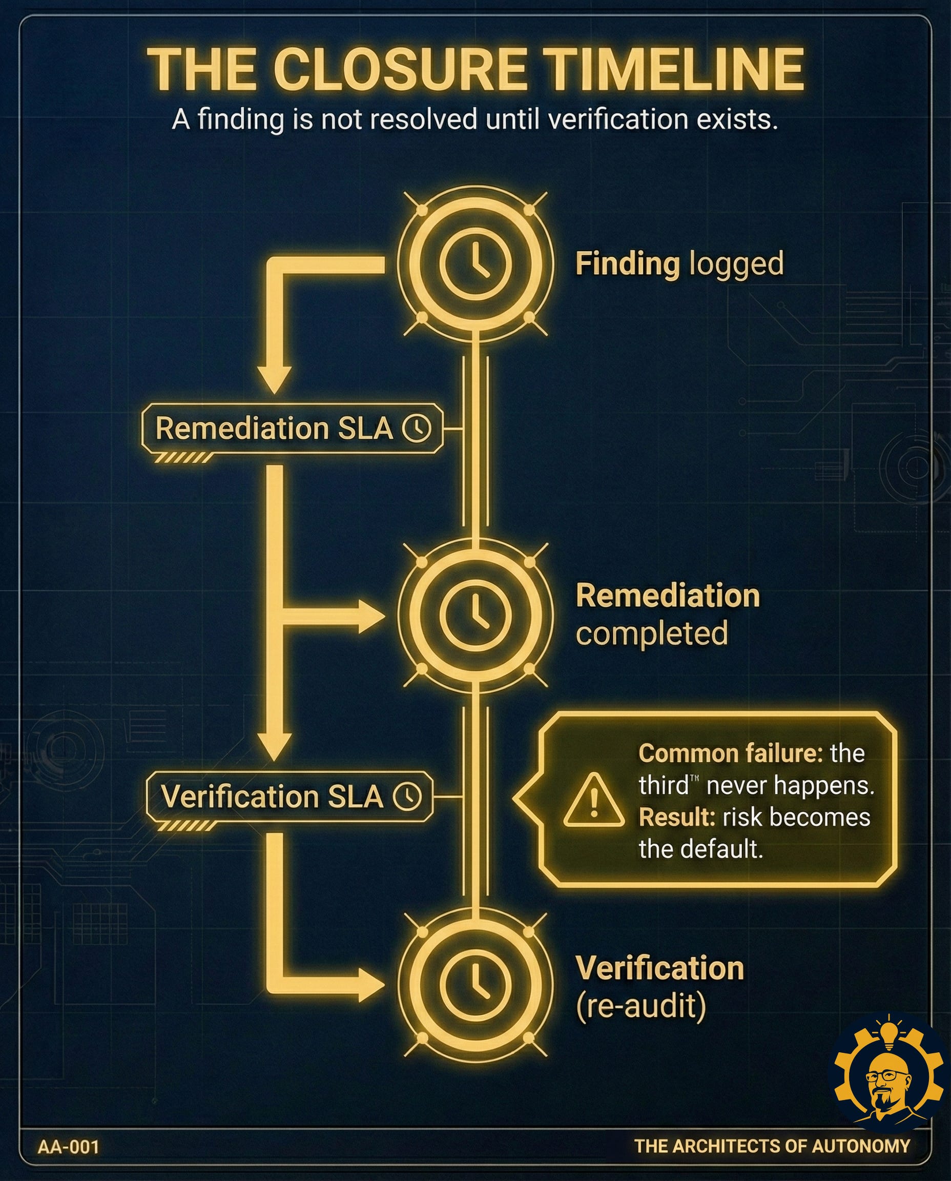 A re-audit confirms the change. Closeout evidence is logged. The finding is not “resolved” because someone said it was. It is resolved because proof exists.