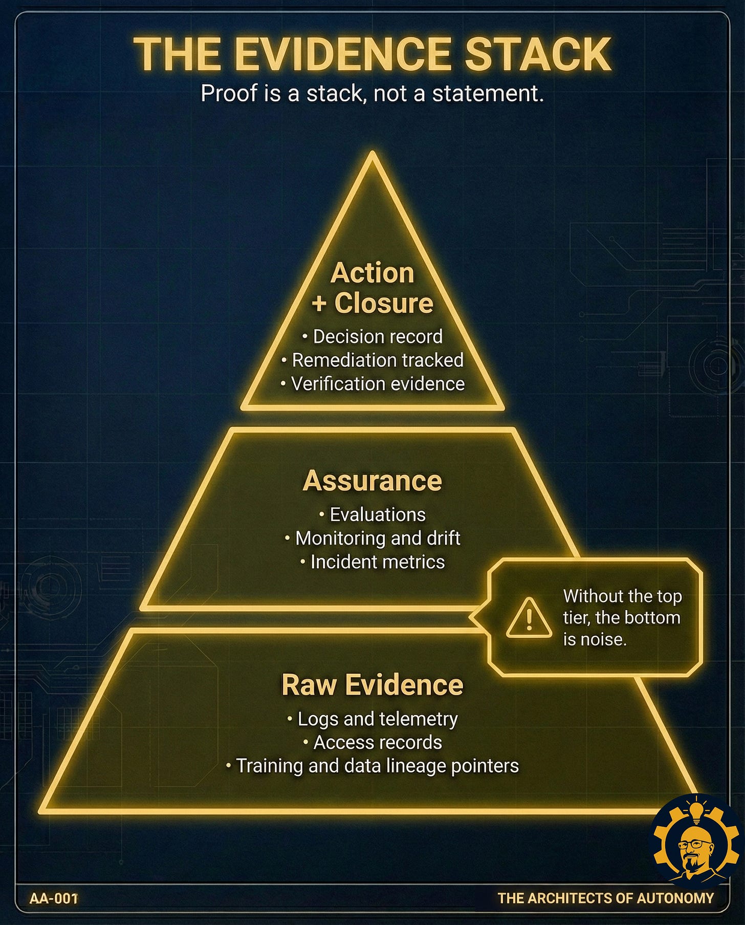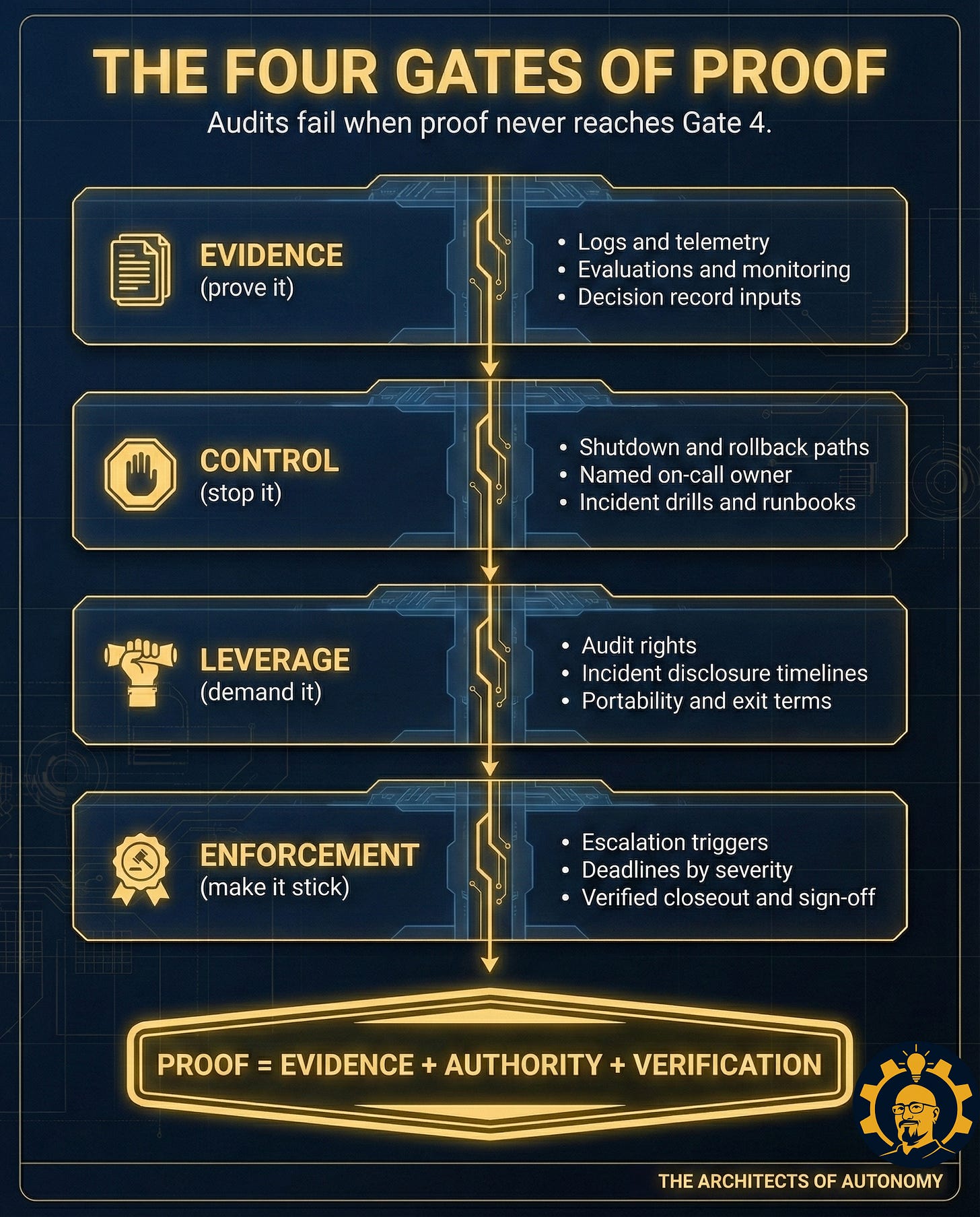 Here is the problem: a recorded finding is not proof. Proof is Evidence + Authority + Verification. Most AI audits have evidence. Almost none have authority. Without authority, you do not have governance. You have documentation of the moment you chose not to act.