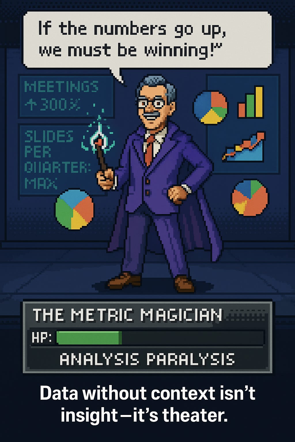 He dazzles with endless charts, waving his wand like every graph is a spell of insight. His favorite incantation? āIf the numbers go up, we must be winning!ā Yet when you look closer, his power comes from vanity metricsāslides per quarter, meetings scheduledānot actual outcomes. The audience claps, the charts glow, but customers keep slipping away.