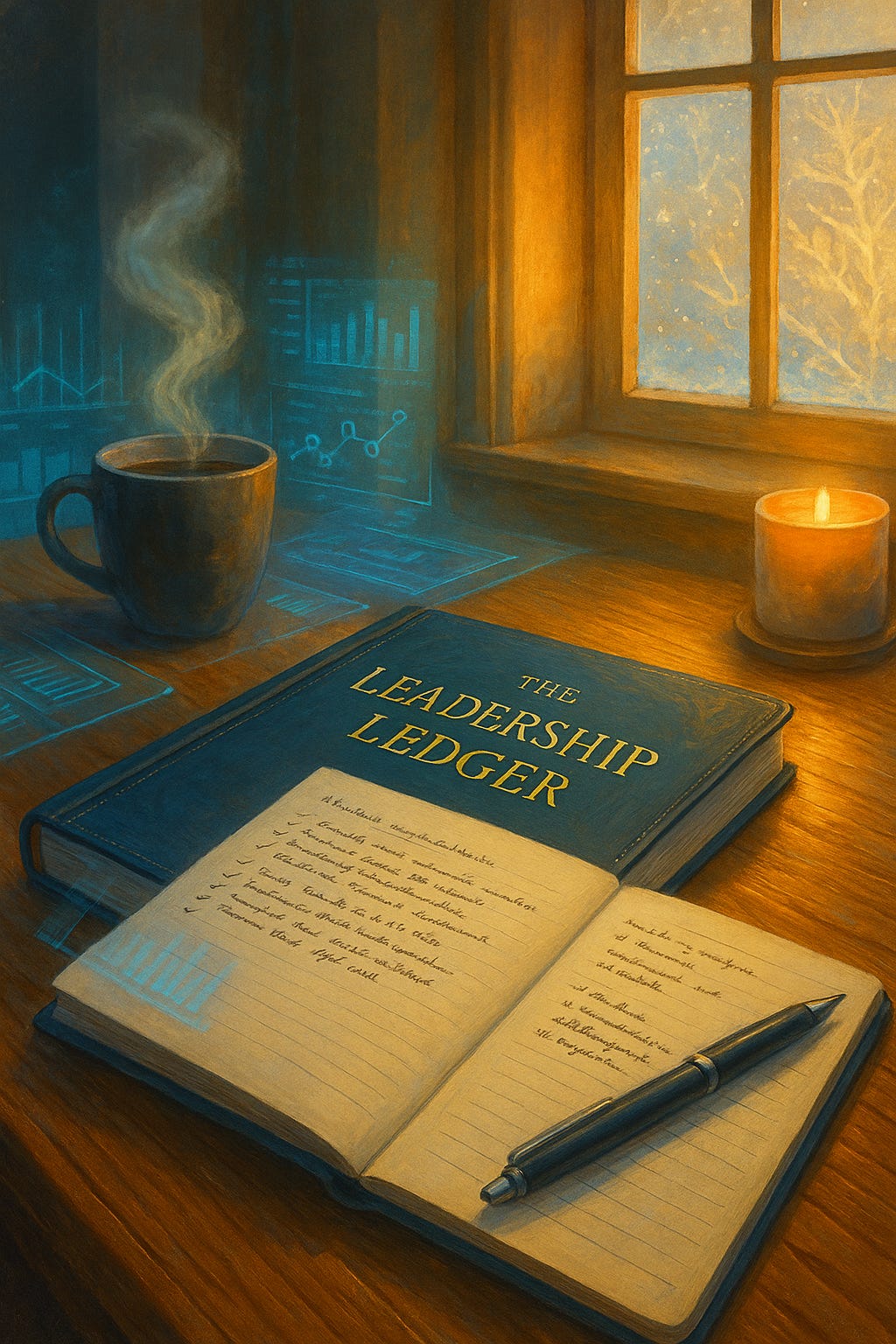 A leather-bound notebook embossed THE LEADERSHIP LEDGER waits patiently beside a steaming mug. The air holds that year-end stillness — the moment right before a leader finally lets the noise settle and the truth speak.