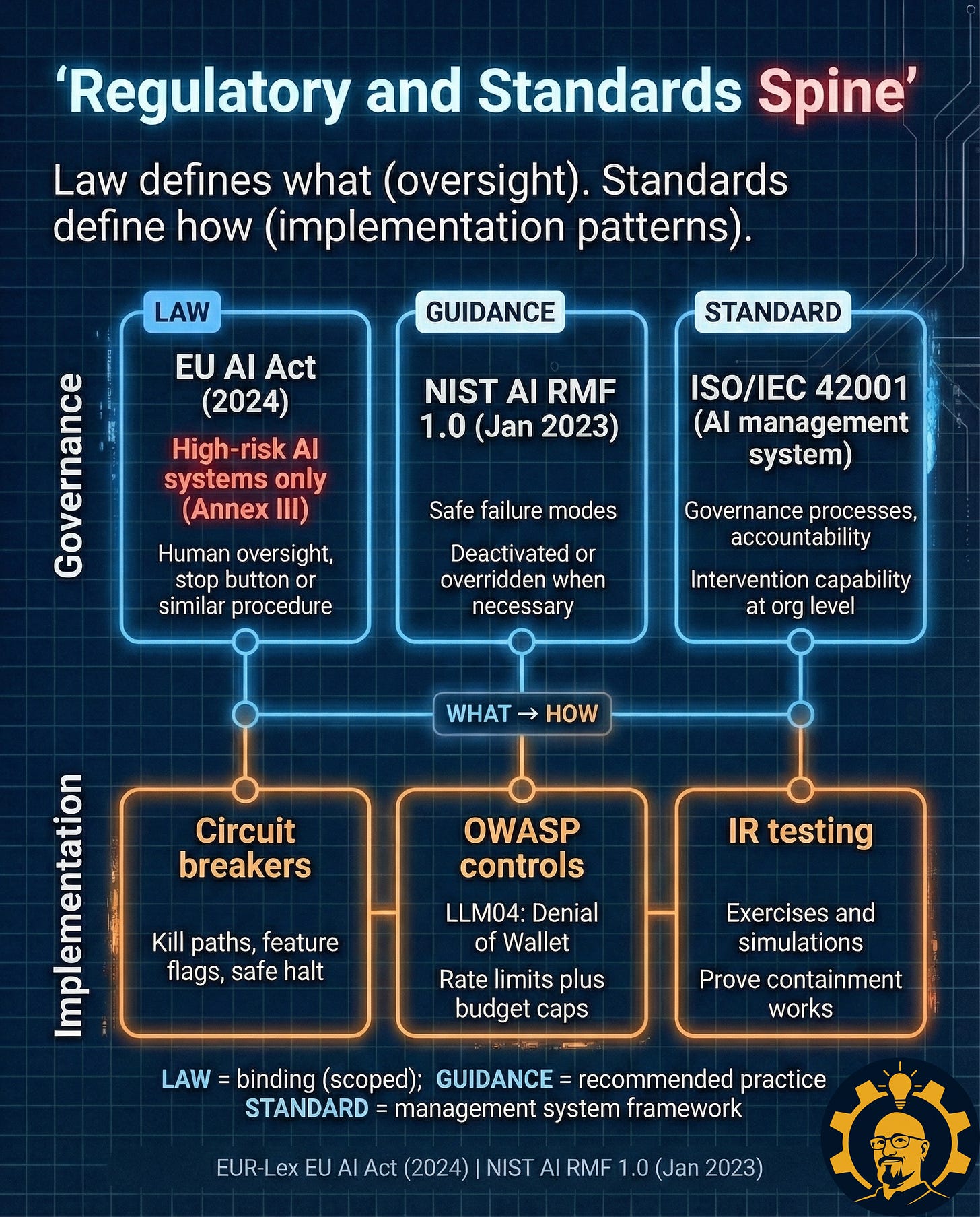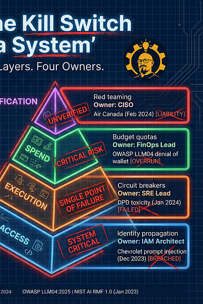 Caption: A kill switch is a four-layer control stack with clear owners. Access (IAM), Execution (SRE), Spend (FinOps), Verification (CISO). Sources: OWASP LLM04:2025 | NIST AI RMF 1.0 (Jan 2023) (Incident examples referenced in the graphic are documented in the post sources for Air Canada, TechCrunch, and BBC.)