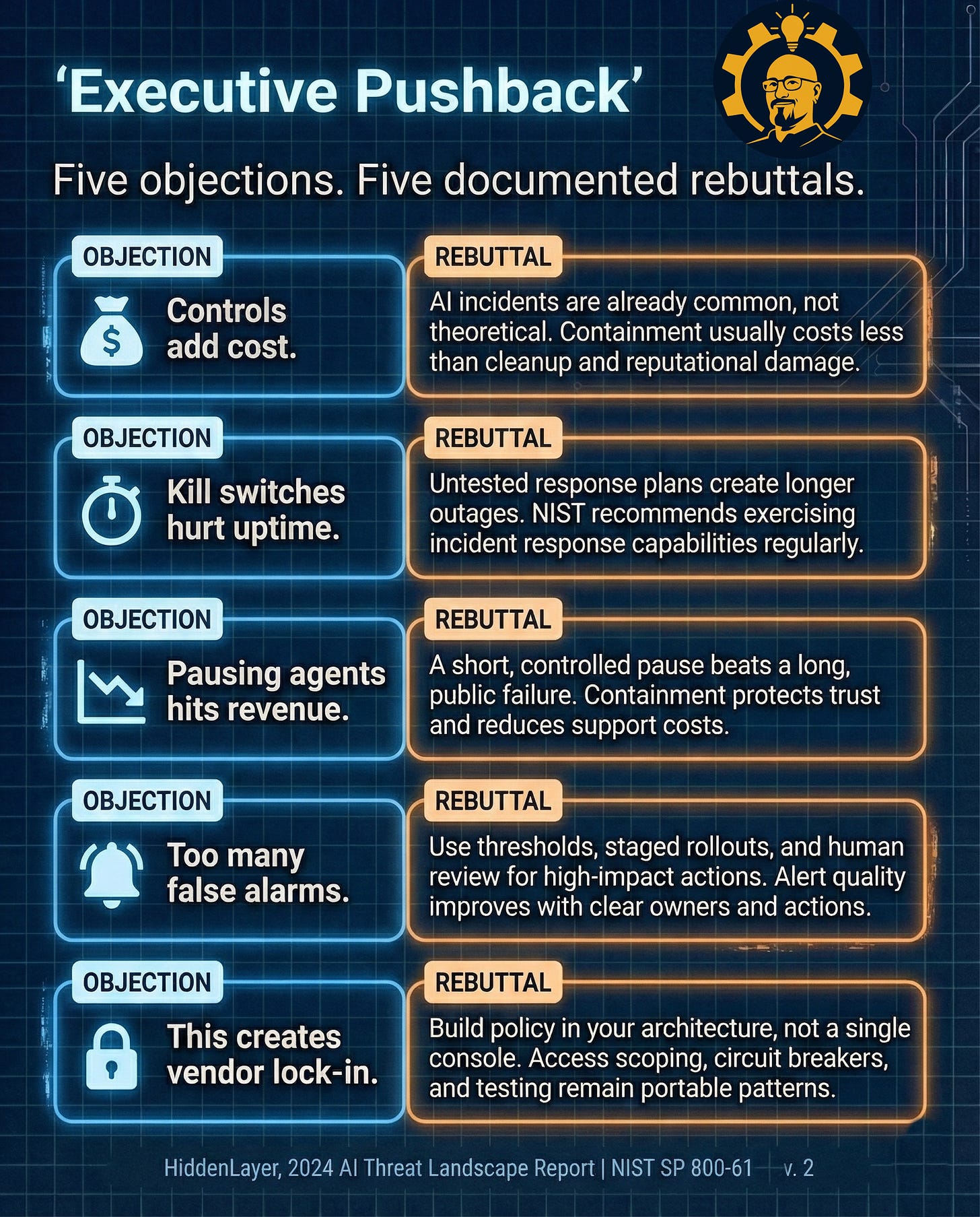 Caption: Five objections. Five documented rebuttals. Keep rebuttals short so scanning feels effortless. Sources: HiddenLayer, 2024 AI Threat Landscape Report | NIST SP 800-61 Rev. 2