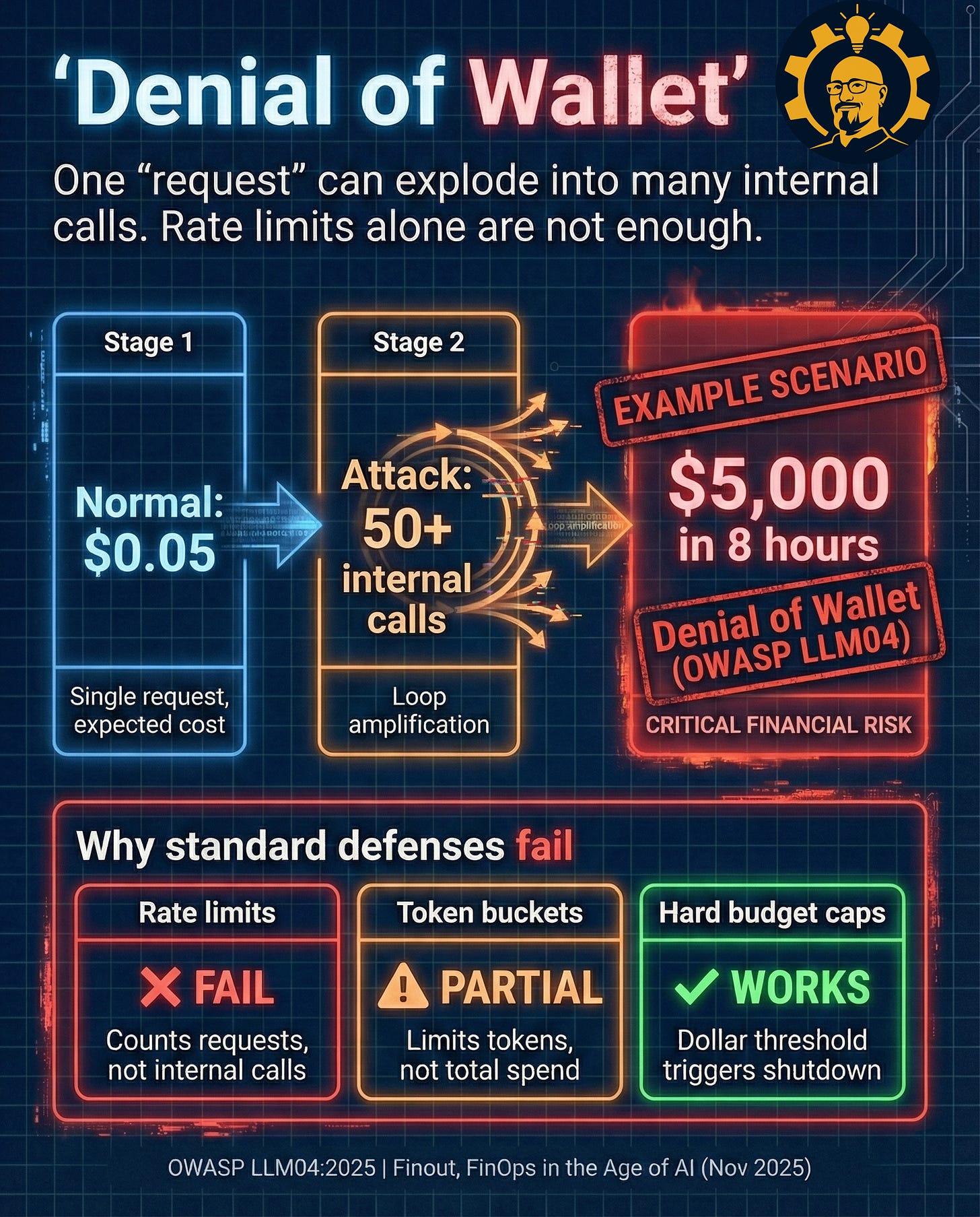 Common failure pattern: Denial-of-Wallet scenarios, one prompt generates thousands of dollars in API calls