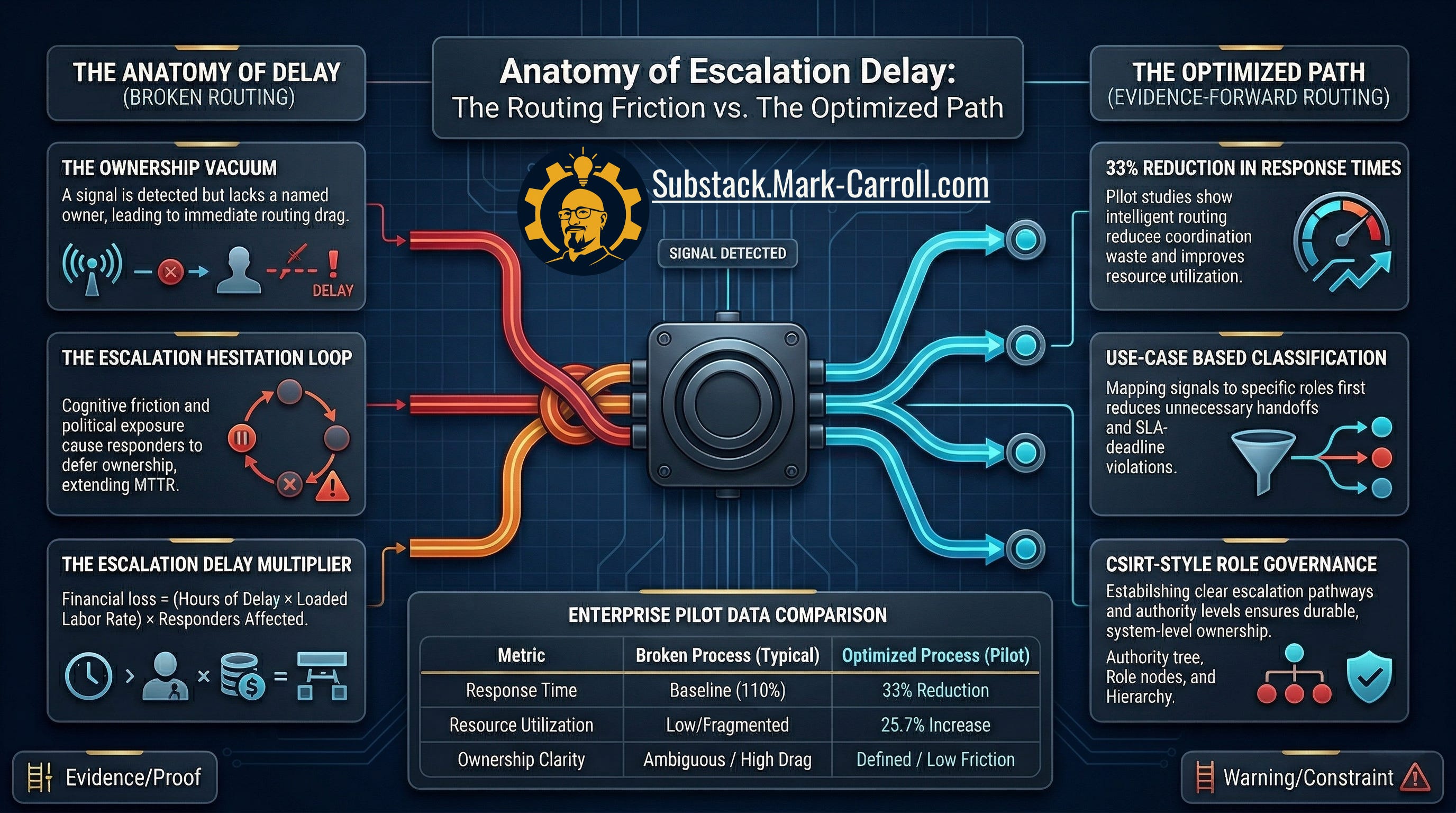 If a large share of recovery time is consumed by coordination, identification, waiting, and wrong-team routing before meaningful repair work begins, then escalation delay is not a minor pre-incident annoyance. It is a major contributor to the shape and cost of recovery itself. The expensive part may already be compounding before the outage is officially declared.