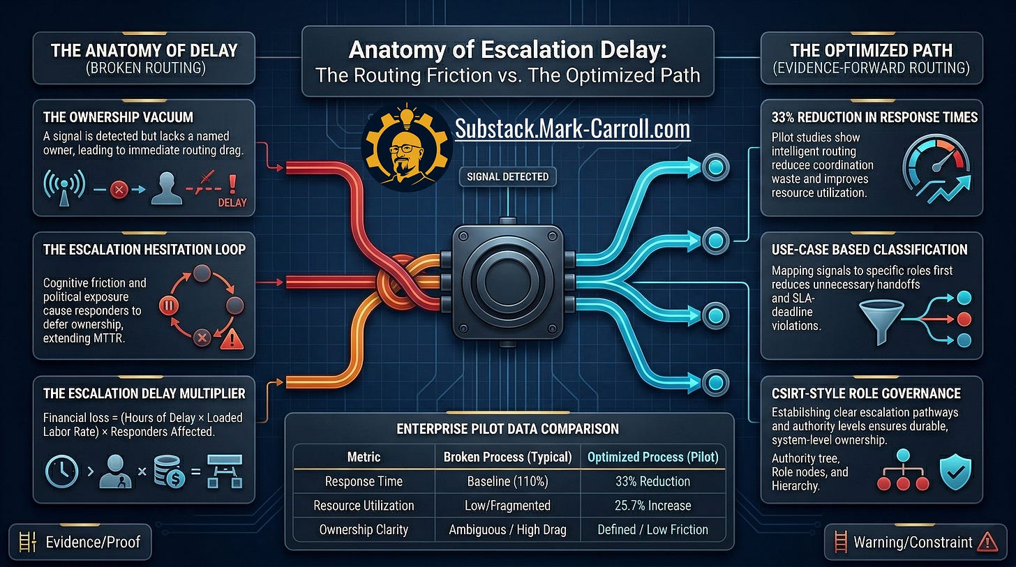 Escalation delay = the gap between first credible signal and named owner with authority to act.