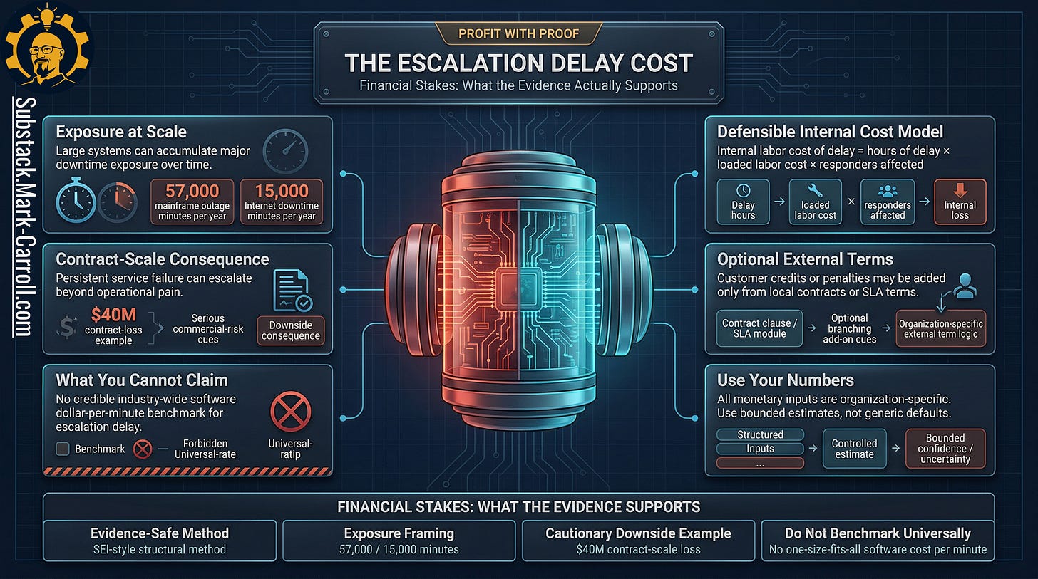 This is where most articles get sloppy. The evidence does not support a universal software dollars-per-minute benchmark for escalation delay. There is no clean public number you can borrow, place into a chart, and treat like revealed truth. You have likely seen those slides, the ones that claim $X per minute of downtime applies to your organization. They rarely survive a real question from finance.