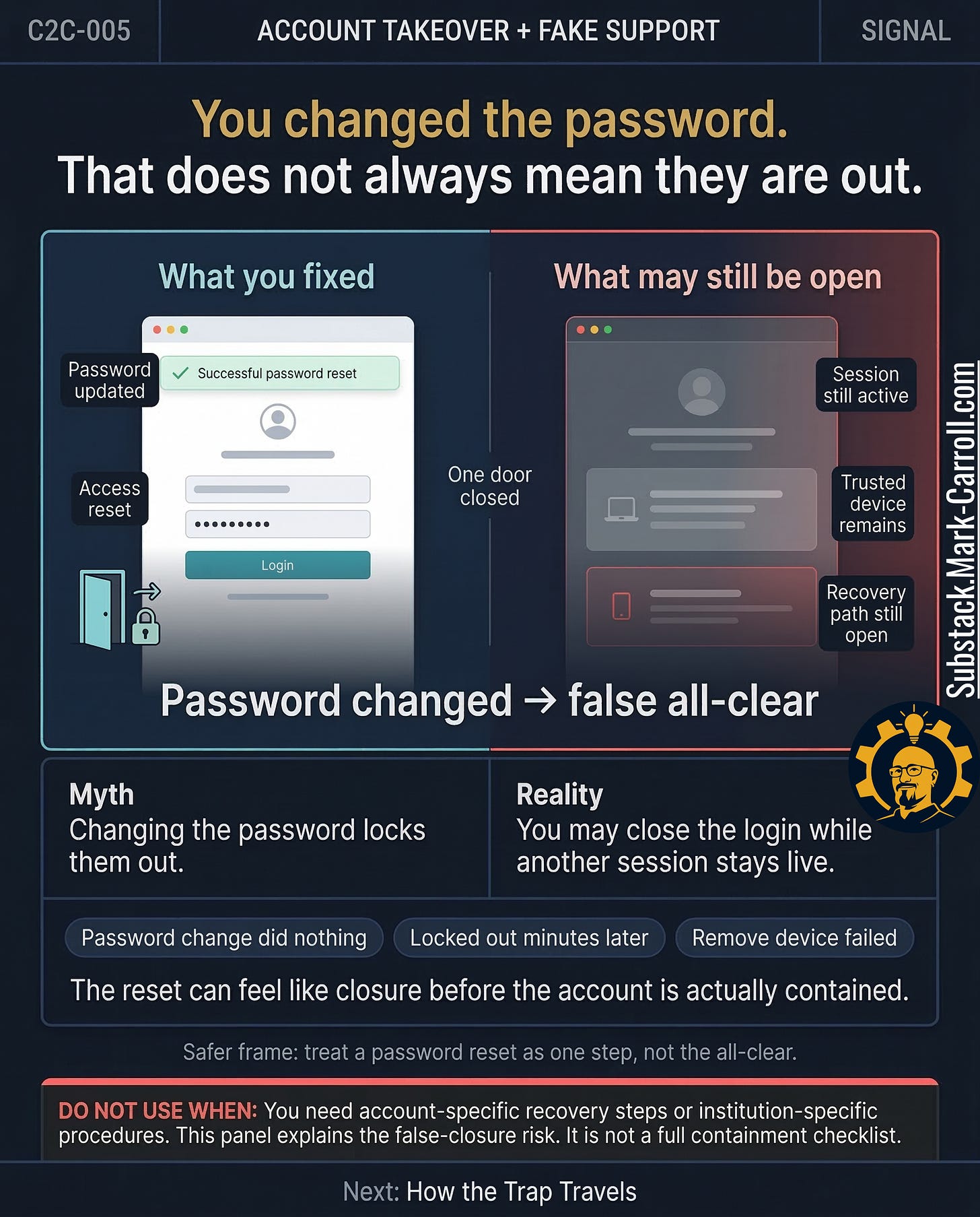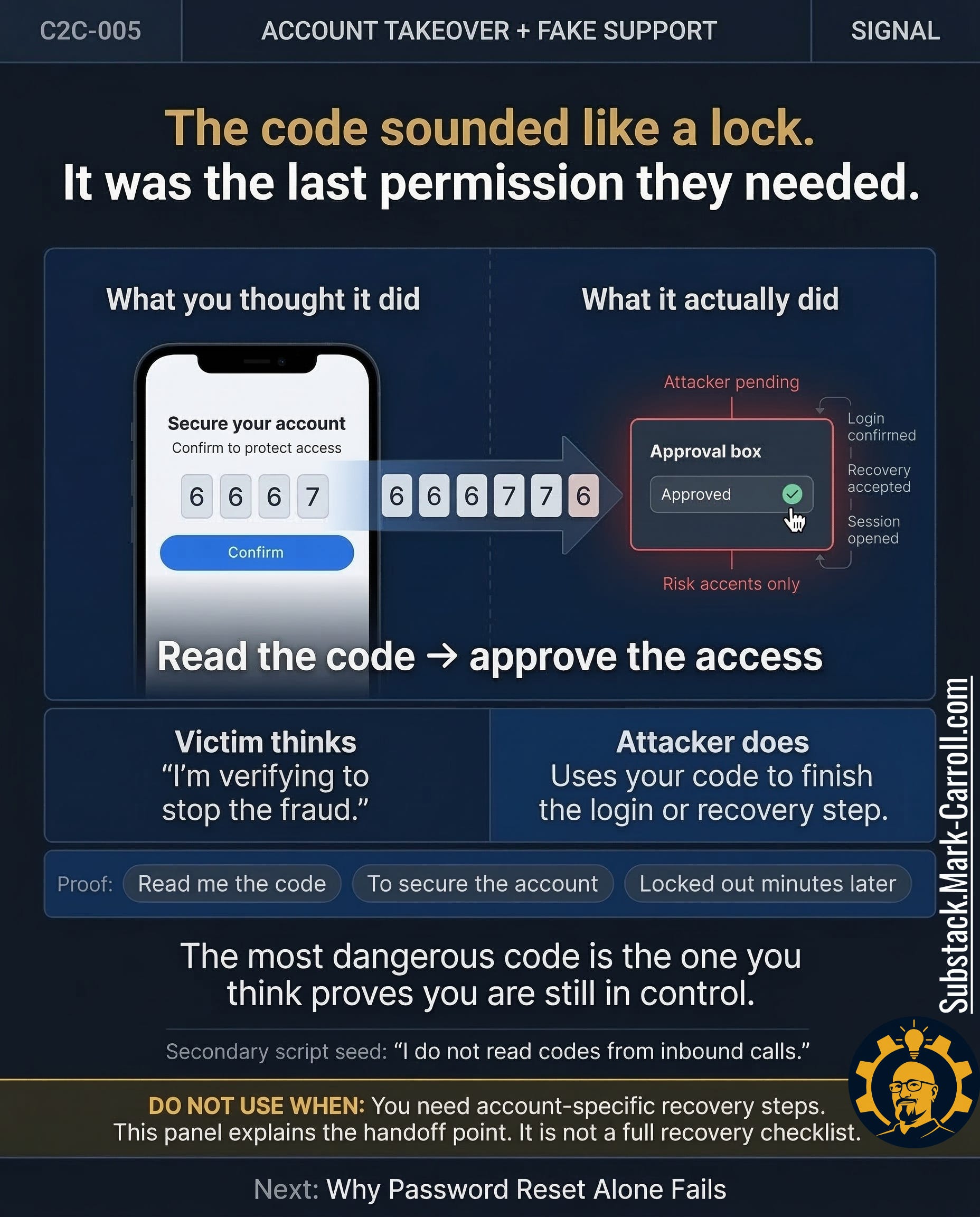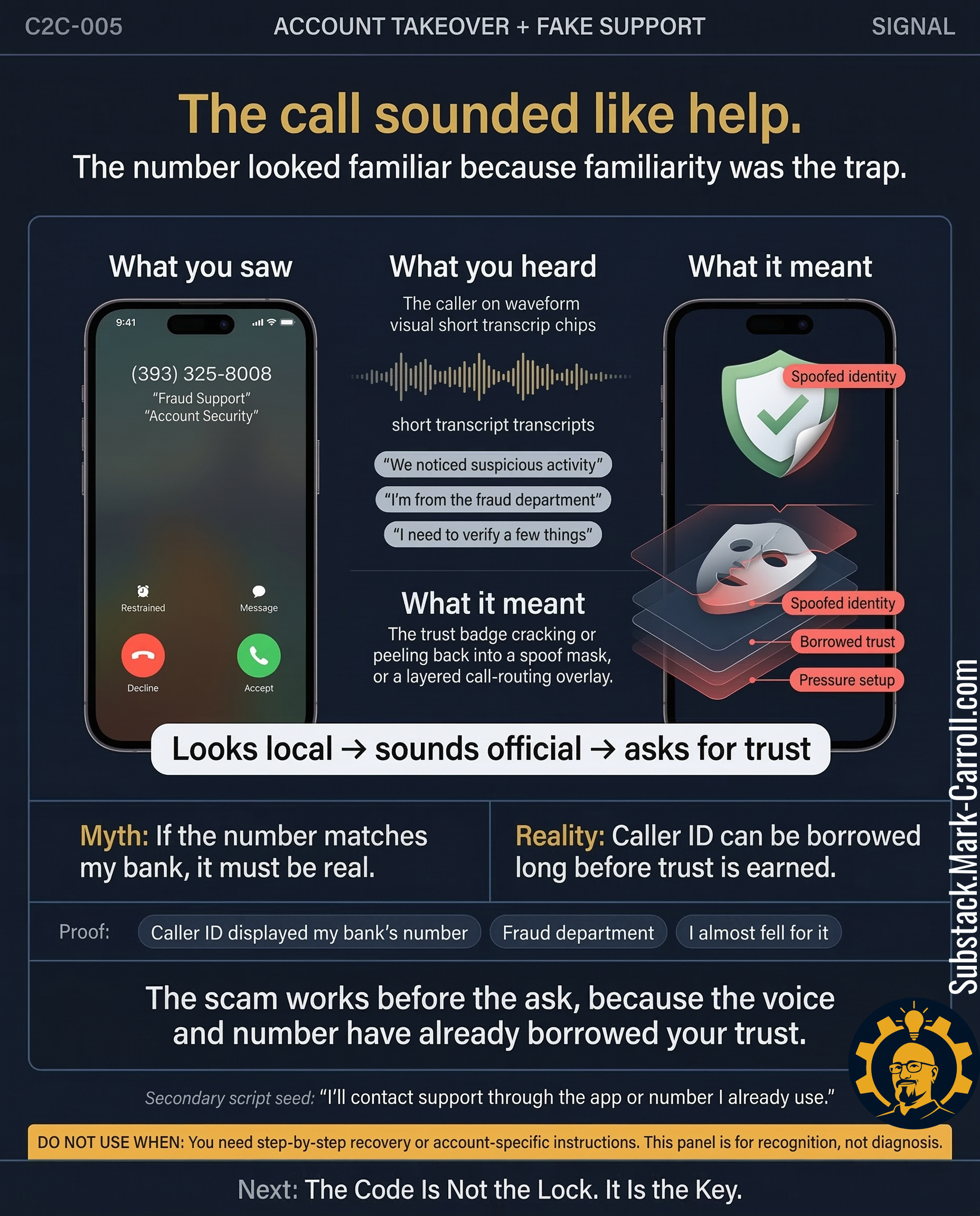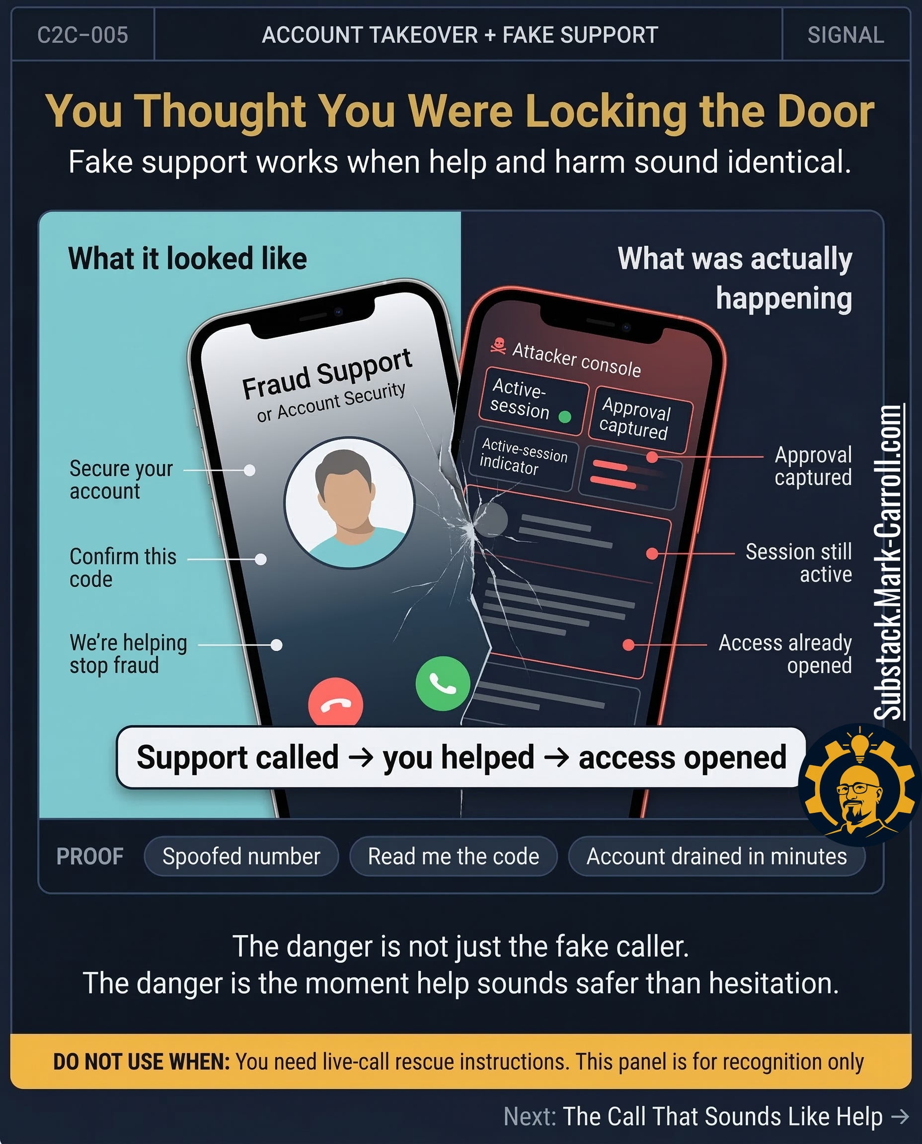 This episode has one job: make fake-support account takeover recognizable before panic turns cooperation into compromise. By the end, you will know how the pattern works, how it spreads, why false closure happens after the call, and what calmer post-call steps are safer to take next.