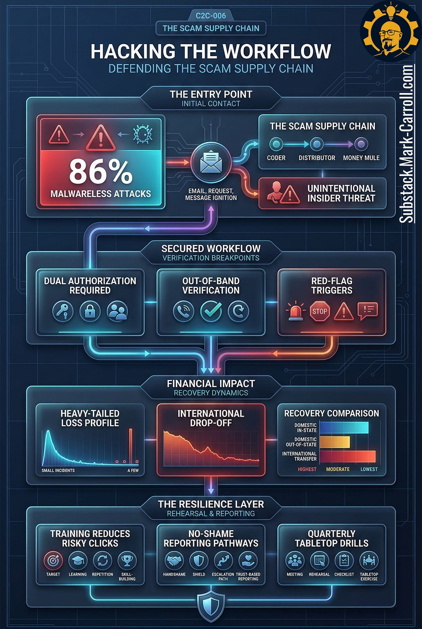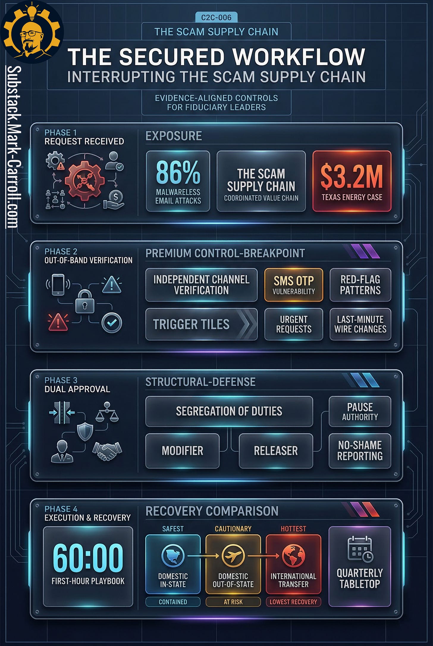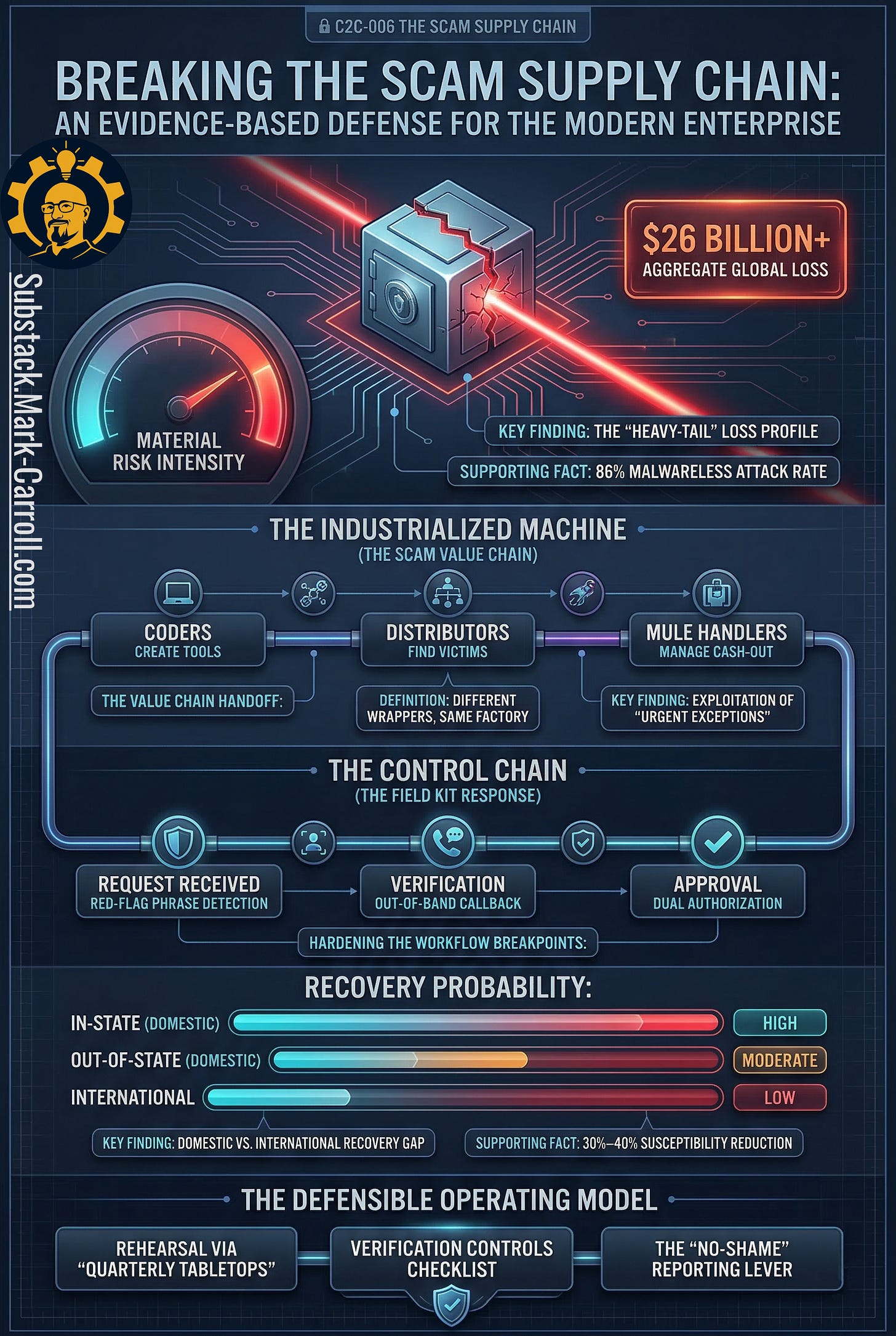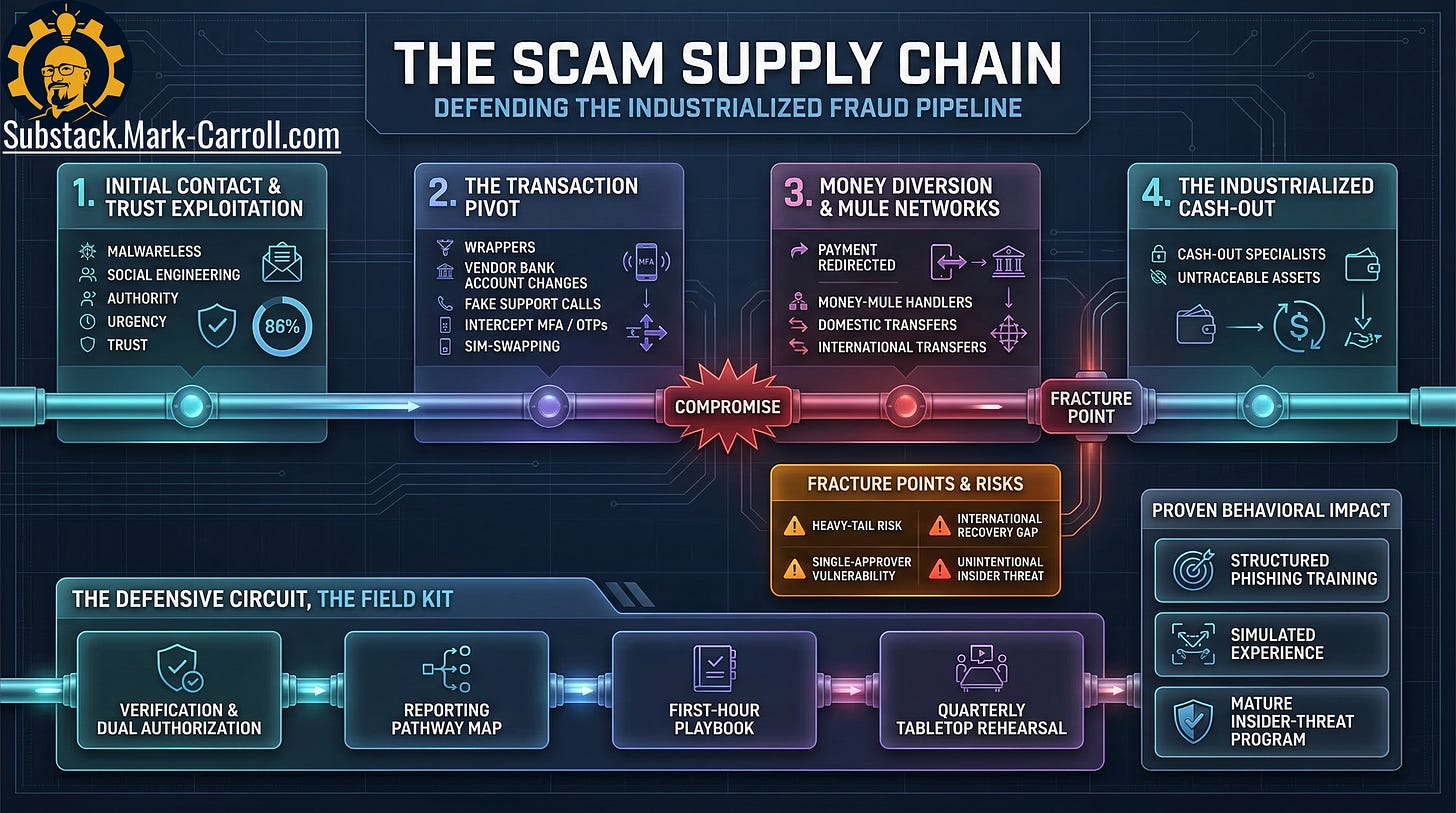 Scams have scaled into a supply chain. You are not facing a parade of lone operators improvising in dark basements. You are facing reusable scripts, rented credibility, specialized handoffs, and workflow pressure applied at the exact moments when someone inside your organization can still say yes alone. This episode is about how that machine works, why it spreads so efficiently, and what leaders can do to harden the few workflows where social engineering turns approvals into cash.